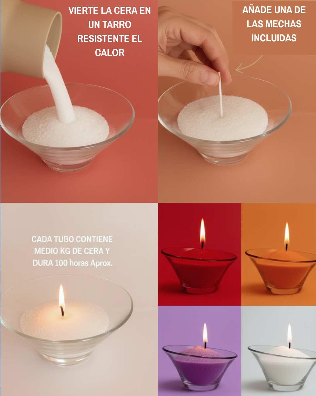 Cada tubo contiene 500 g de cera de arena perlada, suficiente para crear varias velas. Si la usas con cabeza, te da hasta 100 horas de aroma y buen rollo.